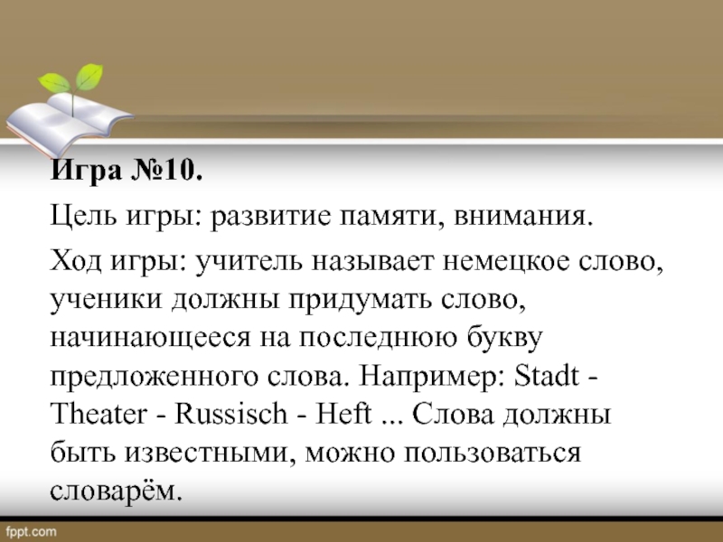 ученики должны придумать слово, начинающееся на последнюю букву предложенного слова. Например: Stadt - Theater - Russisch - Heft ... Слова должны быть известными, можно пользоваться словарём.