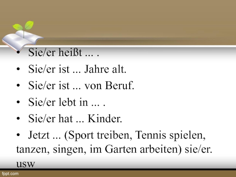 • Jetzt ... (Sport treiben, Tennis spielen, tanzen, singen, im Garten arbeiten) sie/er. usw