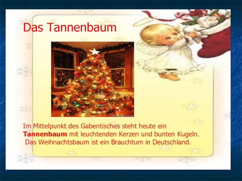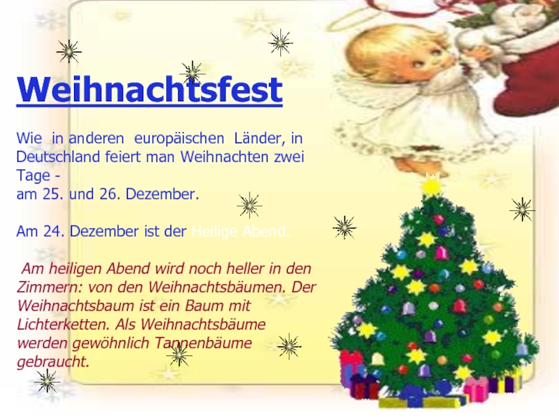 Am heiligen Abend wird noch heller in den Zimmern: von den Weihnachtsbäumen. Der Weihnachtsbaum ist ein Baum mit Lichterketten. Als Weihnachtsbäume werden gewöhnlich Tannenbäume gebraucht.