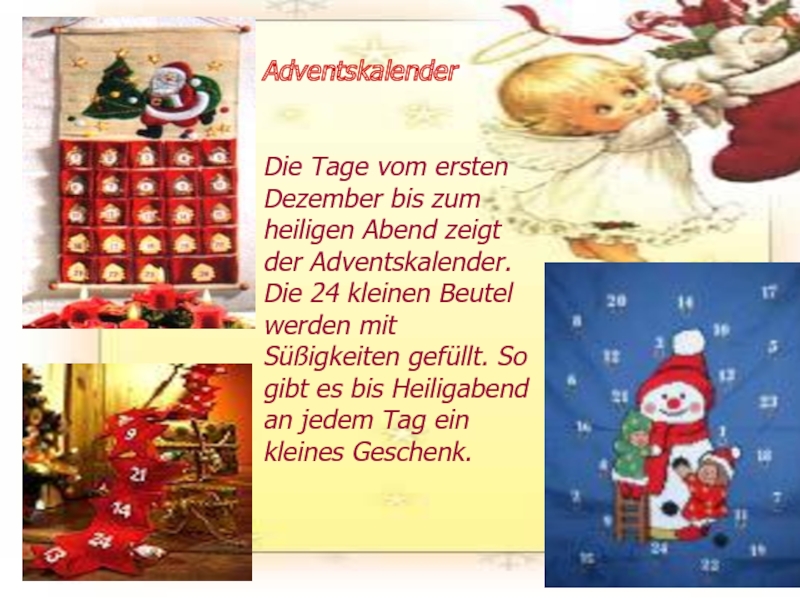 die Geburt Christi, die vier Sonntage vor Weihnachten umfasst. Viele Menschen machen Adventskränze. Am ersten Sonntag zündet man die erste Kerze an, am zweiten Sonntag – die zweite Kerze, am dritten – die dritte Kerze an. Am letzten Sonntag brennen alle vier Kerzen.