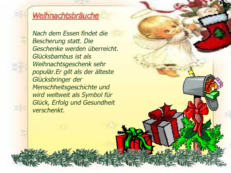 Glücksbambus ist als Weihnachtsgeschenk sehr populär.Er gilt als der älteste Glücksbringer der Menschheitsgeschichte und wird weltweit als Symbol für Glück, Erfolg und Gesundheit verschenkt.