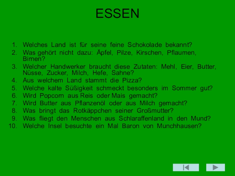 ESSEN Welches Land ist für seine feine Schokolade bekannt?Was gehört nicht dazu: Äpfel, Pilze, Kirschen, Pflaumen, Birnen?Welcher