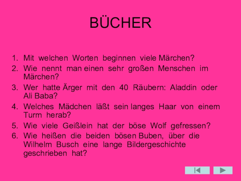 BÜCHERMit welchen Worten beginnen viele Märchen?Wie nennt man einen sehr großen Menschen im Märchen?Wer hatte Ärger mit