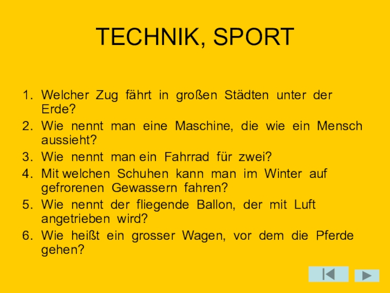 TECHNIK, SPORTWelcher Zug fährt in großen Städten unter der Erde?Wie nennt man eine Maschine, die wie ein