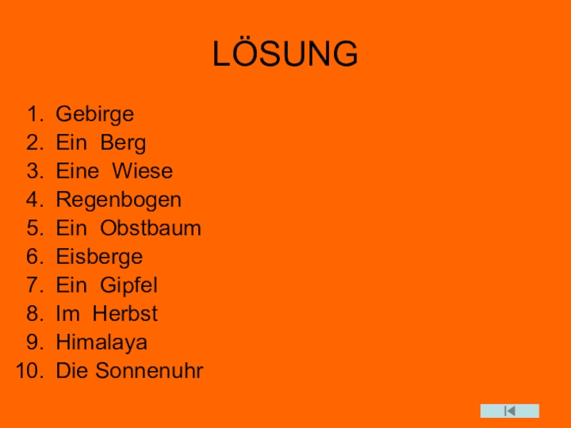 LÖSUNGGebirgeEin BergEine WieseRegenbogenEin ObstbaumEisbergeEin GipfelIm HerbstHimalayaDie Sonnenuhr