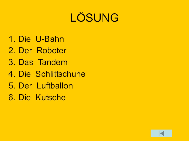 LÖSUNGDie U-BahnDer RoboterDas TandemDie SchlittschuheDer LuftballonDie Kutsche