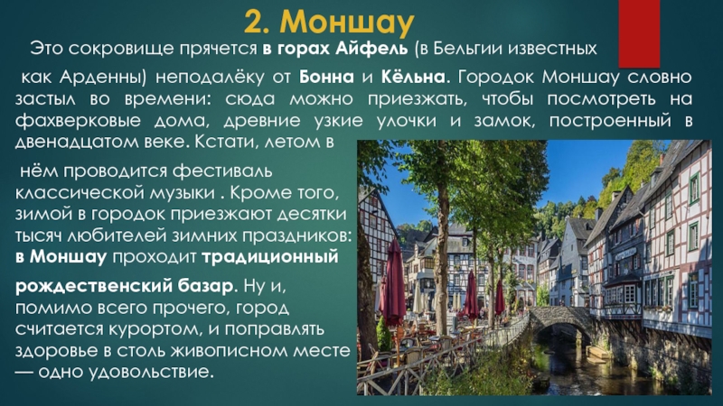 как Арденны) неподалёку от Бонна и Кёльна. Городок Моншау словно застыл во времени: сюда можно приезжать, чтобы посмотреть на фахверковые дома, древние узкие улочки и замок, построенный в двенадцатом веке. Кстати, летом в