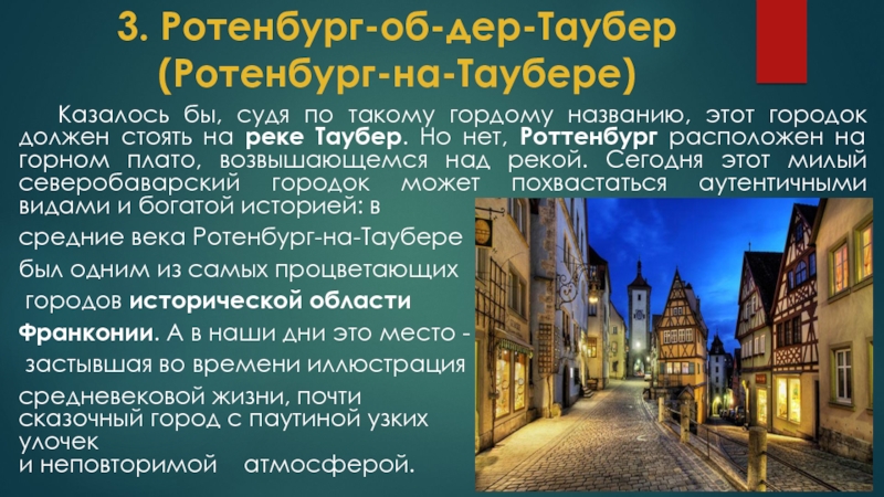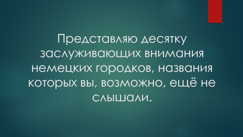 Слайд 3Представляю десятку заслуживающих внимания немецких городков, названия которых вы, возможно, ещё