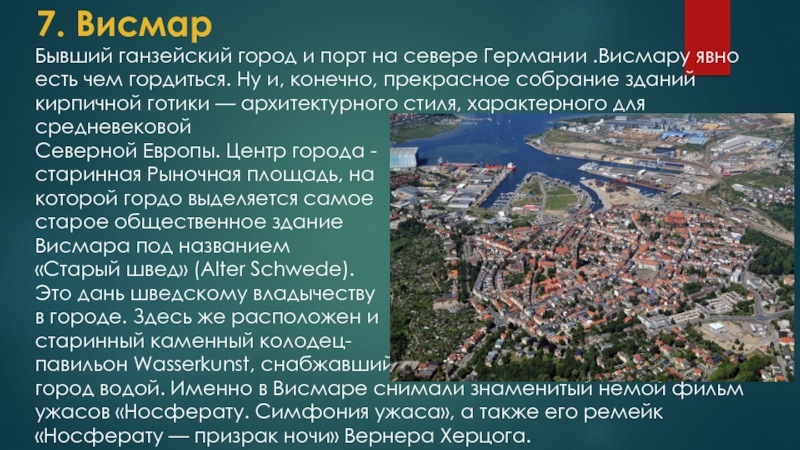 есть чем гордиться. Ну и, конечно, прекрасное собрание зданий кирпичной готики — архитектурного стиля, характерного для средневековой Северной Европы. Центр города - старинная Рыночная площадь, на которой гордо выделяется самое старое общественное здание Висмара под названием «Старый швед» (Alter Schwede). Это дань шведскому владычеству в городе. Здесь же расположен и старинный каменный колодец- павильон Wasserkunst, снабжавший город водой. Именно в Висмаре снимали знаменитый немой фильм ужасов «Носферату. Симфония ужаса», а также его ремейк «Носферату — призрак ночи» Вернера Херцога.