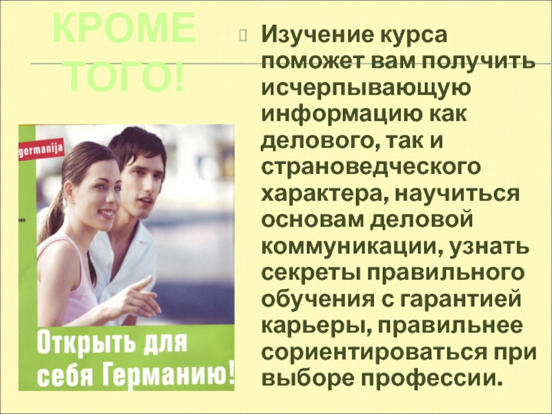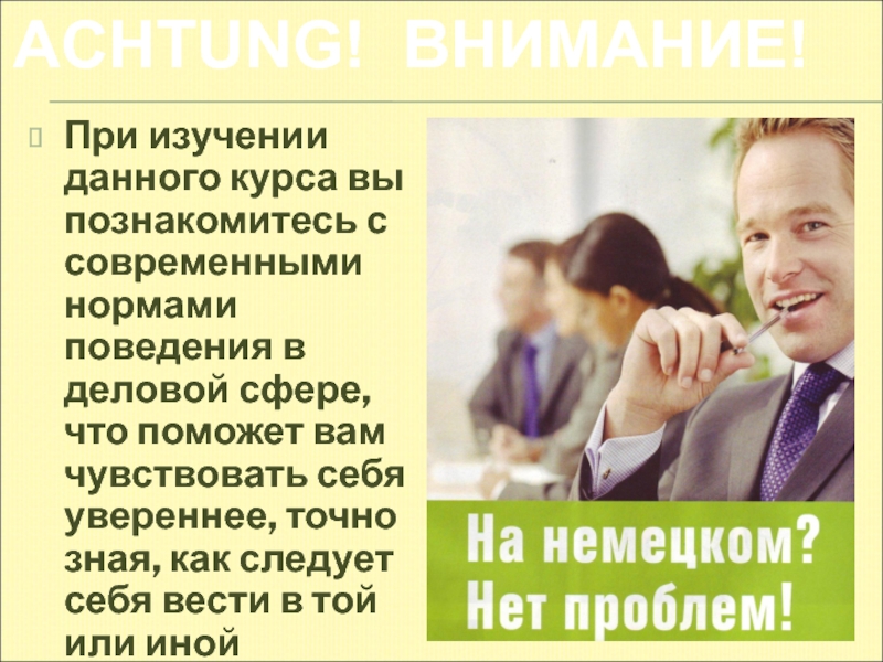 Изучение данного курса поможет вам приобрести начальные навыки ведения деловой беседы на немецком языке: