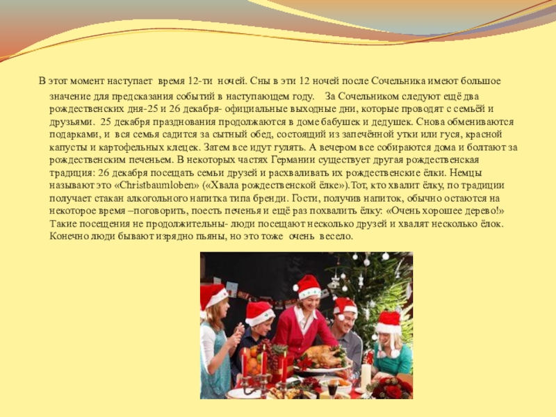 12 ночей после Сочельника имеют большое значение для предсказания событий в наступающем году. За Сочельником следуют ещё два рождественских дня-25 и 26 декабря- официальные выходные дни, которые проводят с семьёй и друзьями. 25 декабря празднования продолжаются в доме бабушек и дедушек. Снова обмениваются подарками, и вся семья садится за сытный обед, состоящий из запечённой утки или гуся, красной капусты и картофельных клецек. Затем все идут гулять. А вечером все собираются дома и болтают за рождественским печеньем. В некоторых частях Германии существует другая рождественская традиция: 26 декабря посещать семьи друзей и расхваливать их рождественские ёлки. Немцы называют это «Christbaumloben» («Хвала рождественской ёлке»).Тот, кто хвалит ёлку, по традиции получает стакан алкогольного напитка типа бренди. Гости, получив напиток, обычно остаются на некоторое время –поговорить, поесть печенья и ещё раз похвалить ёлку: «Очень хорошее дерево!» Такие посещения не продолжительны- люди посещают несколько друзей и хвалят несколько ёлок. Конечно люди бывают изрядно пьяны, но это тоже очень весело.