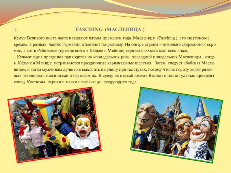 Канун Великого поста часто называют пятым временем года. Масленицу (Fasching ), это «шутовское