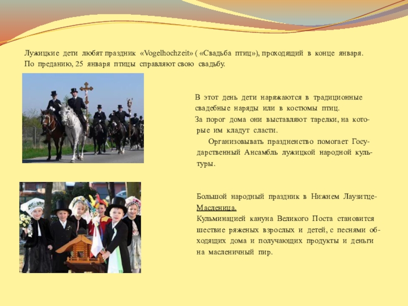 Лужицкие дети любят праздник «Vogelhochzeit» ( «Свадьба птиц»), проходящий в конце