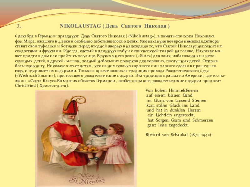 фон Мира, жившего в 4 веке и особенно заботившегося о детях. Уже накануне вечером немецкая детвора