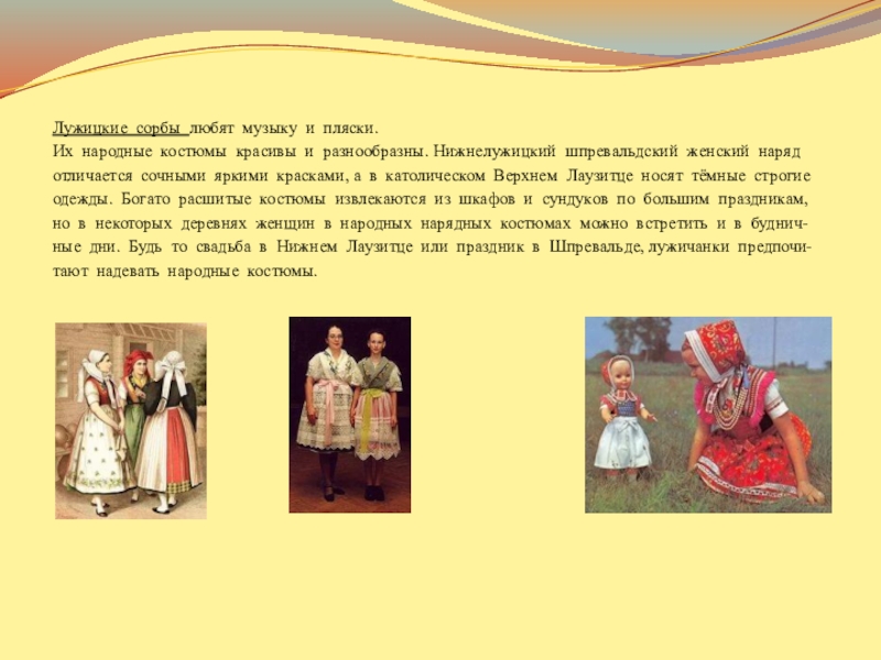 Они сумели сохранить свой собственный славянский язык, самобытную культуру и бе- режно хранят старинные народные обычаи.