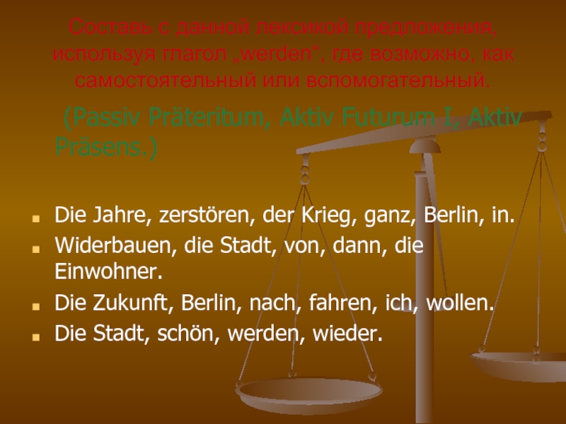 (Passiv Präteritum, Aktiv Futurum I, Aktiv Präsens.)
