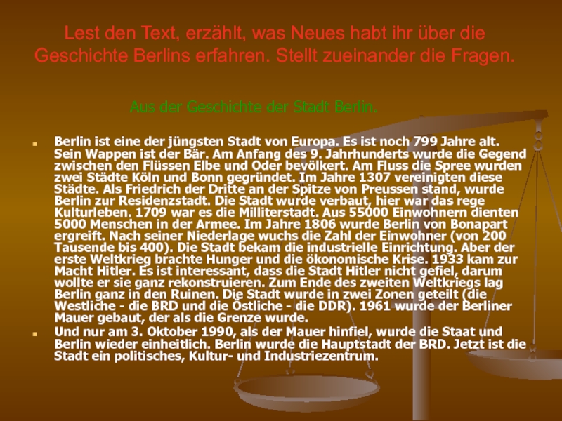 Berlin ist eine der jüngsten Stadt von Europa. Es ist noch 799 Jahre alt. Sein Wappen ist der Bär. Am Anfang des 9. Jahrhunderts wurde die Gegend zwischen den Flüssen Elbe und Oder bevölkert. Am Fluss die Spree wurden zwei Städte Köln und Bonn gegründet. Im Jahre 1307 vereinigten diese Städte. Als Friedrich der Dritte an der Spitze von Preussen stand, wurde Berlin zur Residenzstadt. Die Stadt wurde verbaut, hier war das rege Kulturleben. 1709 war es die Milliterstadt. Aus 55000 Einwohnern dienten 5000 Menschen in der Armee. Im Jahre 1806 wurde Berlin von Bonapart ergreift. Nach seiner Niederlage wuchs die Zahl der Einwohner (von 200 Tausende bis 400). Die Stadt bekam die industrielle Einrichtung. Aber der erste Weltkrieg brachte Hunger und die ökonomische Krise. 1933 kam zur Macht Hitler. Es ist interessant, dass die Stadt Hitler nicht gefiel, darum wollte er sie ganz rekonstruieren. Zum Ende des zweiten Weltkriegs lag Berlin ganz in den Ruinen. Die Stadt wurde in zwei Zonen geteilt (die Westliche - die BRD und die Östliche - die DDR). 1961 wurde der Berliner Mauer gebaut, der als die Grenze wurde.