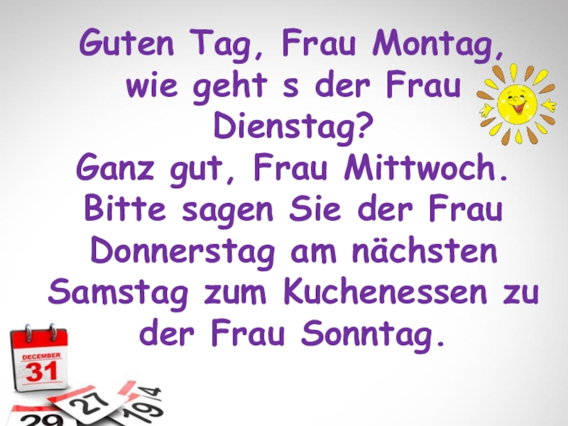 Слайд 4Guten Tag, Frau Montag, wie geht s der Frau Dienstag? Ganz gut, Frau