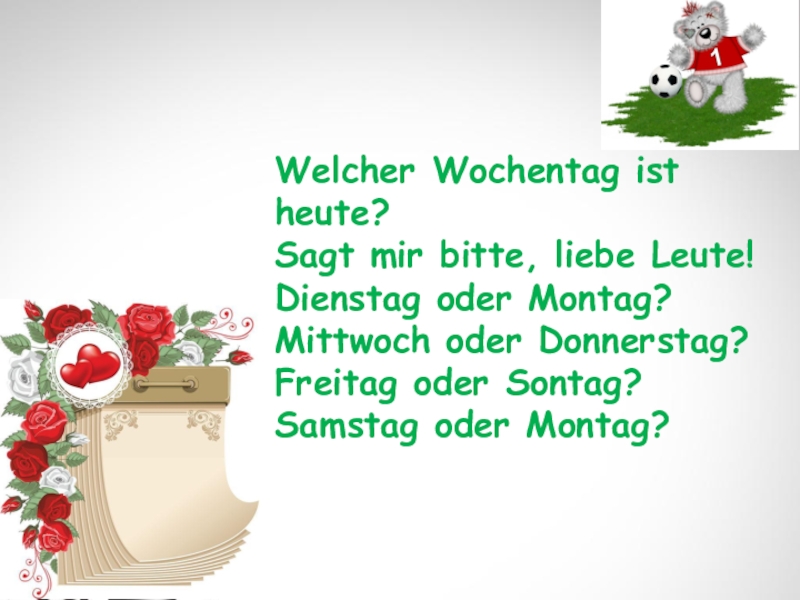 Слайд 7Welcher Wochentag ist heute? Sagt mir bitte, liebe Leute! Dienstag oder Montag? Mittwoch oder