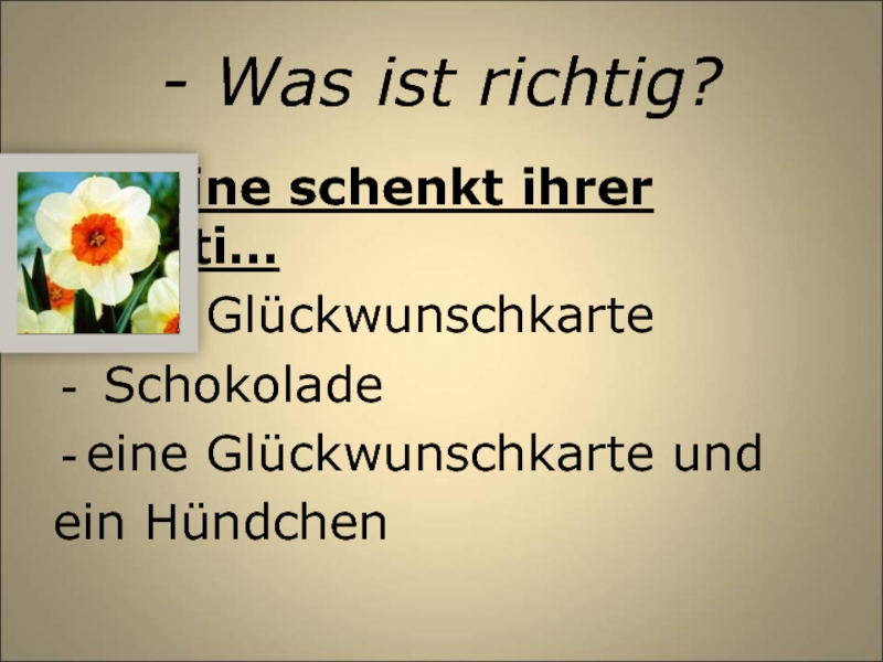 - Was ist richtig?Sabine schenkt ihrer Mutti…eine Glückwunschkarte Schokoladeeine Glückwunschkarte und ein Hündchen