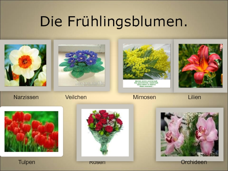 Die Frühlingsblumen.  VeilchenNarzissen     Rosen  Tulpen   MimosenOrchideenLilien