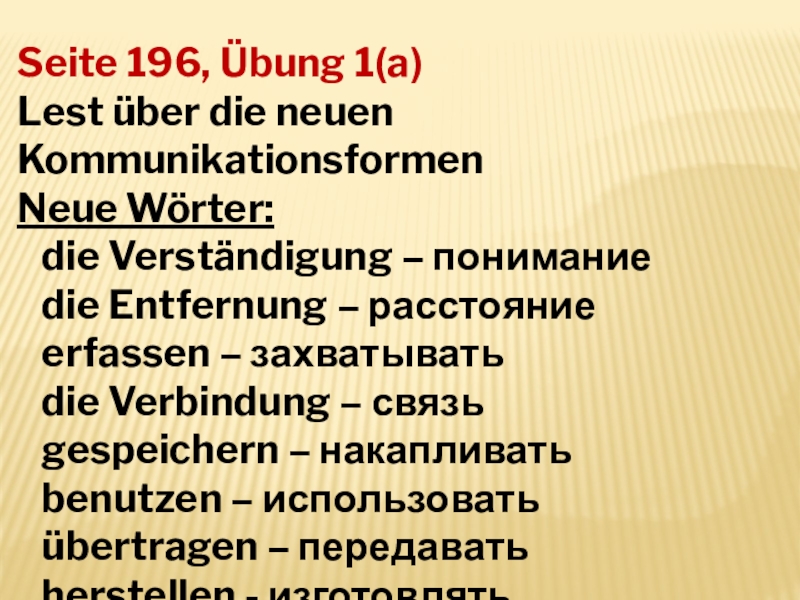 Seite 196, Übung 1(a)Lest über die neuen KommunikationsformenNeue Wörter:  die Verständigung – понимание  die Entfernung