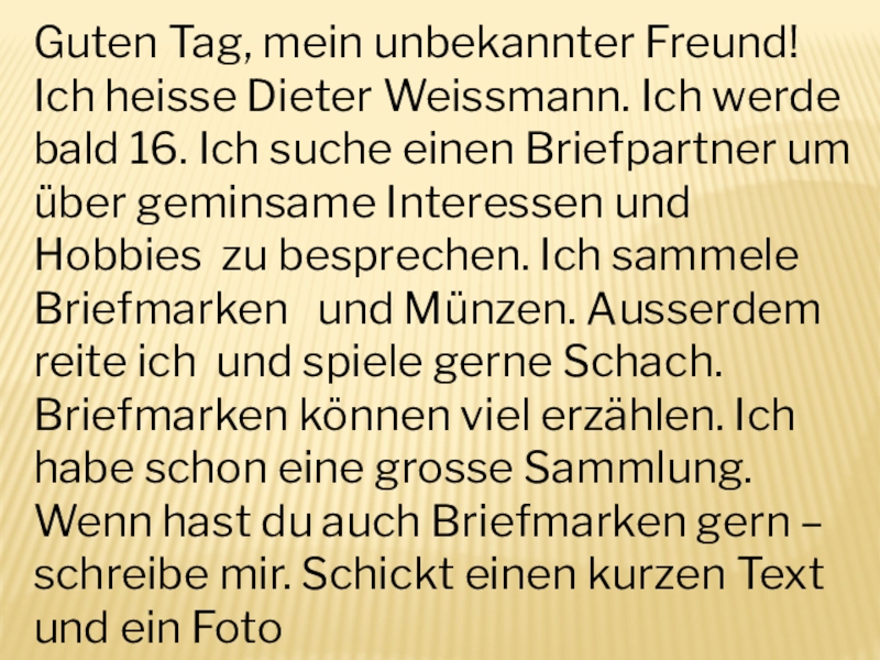 Guten Tag, mein unbekannter Freund!Ich heisse Dieter Weissmann. Ich werde bald 16. Ich suche einen Briefpartner um