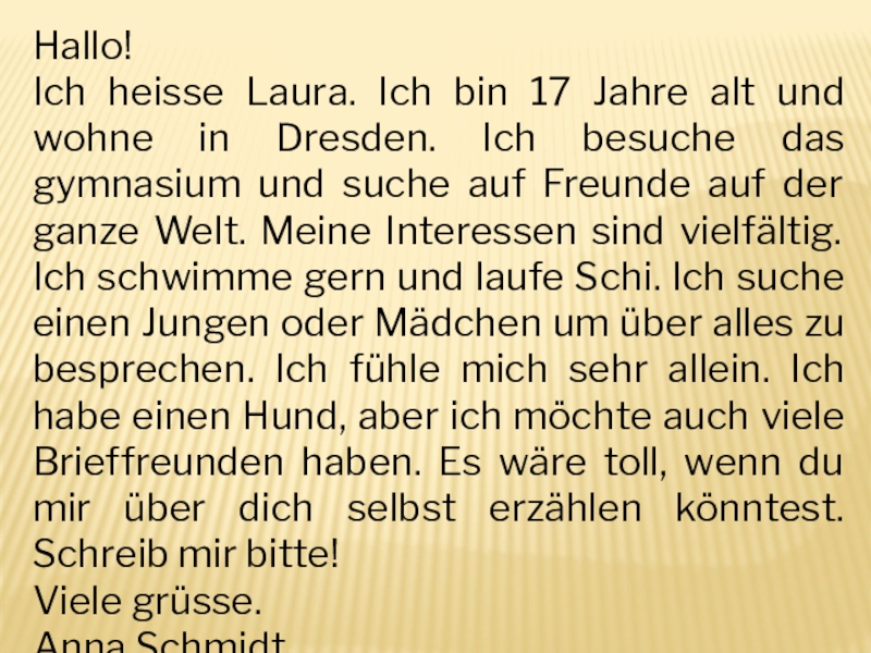 Hallo!Ich heisse Laura. Ich bin 17 Jahre alt und wohne in Dresden. Ich besuche das gymnasium und