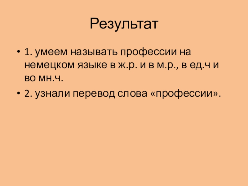 Результат1. умеем называть профессии на немецком языке в ж.р. и в м.р., в ед.ч и во мн.ч.