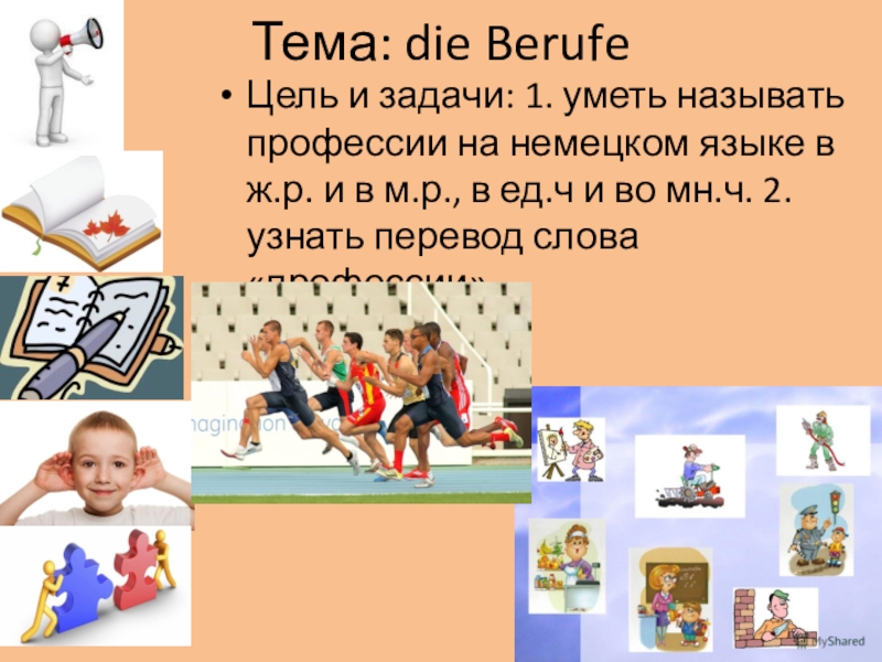Тема: die BerufeЦель и задачи: 1. уметь называть профессии на немецком языке в ж.р. и в м.р.,