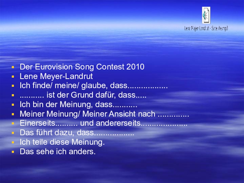 Der Eurovision Song Contest 2010Lene Meyer-LandrutIch finde/ meine/ glaube, dass............................. ist der Grund dafür, dass.....Ich bin der