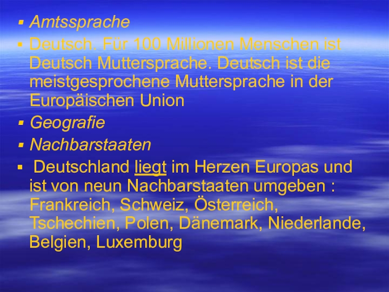 Amtssprache Deutsch. Für 100 Millionen Menschen ist Deutsch Muttersprache. Deutsch ist die meistgesprochene Muttersprache in der Europäischen
