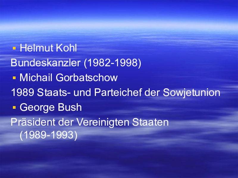Helmut KohlBundeskanzler (1982-1998)Michail Gorbatschow1989 Staats- und Parteichef der SowjetunionGeorge BushPräsident der Vereinigten Staaten (1989-1993)