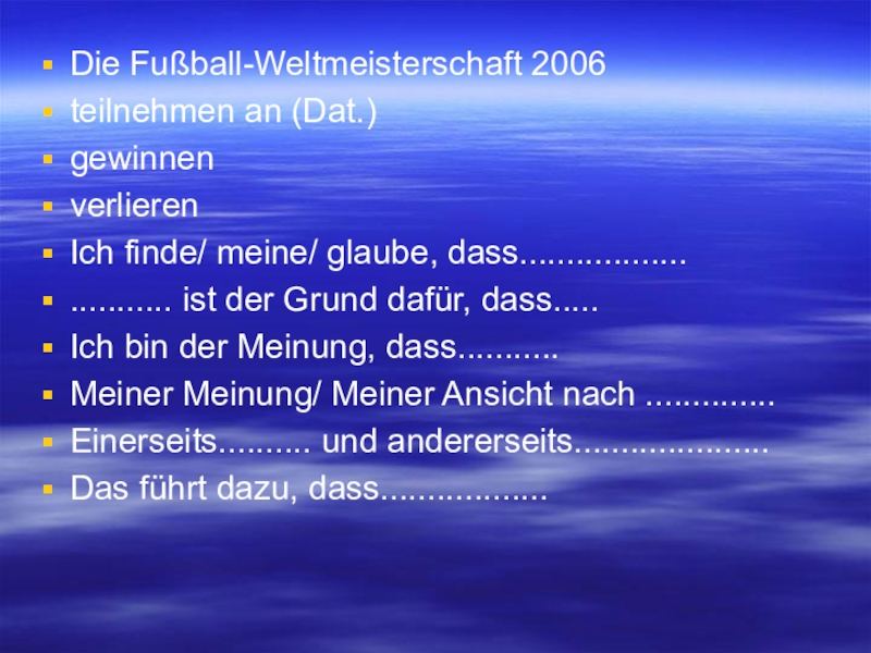 Die Fußball-Weltmeisterschaft 2006teilnehmen an (Dat.)gewinnenverlierenIch finde/ meine/ glaube, dass............................. ist der Grund dafür, dass.....Ich bin der Meinung,
