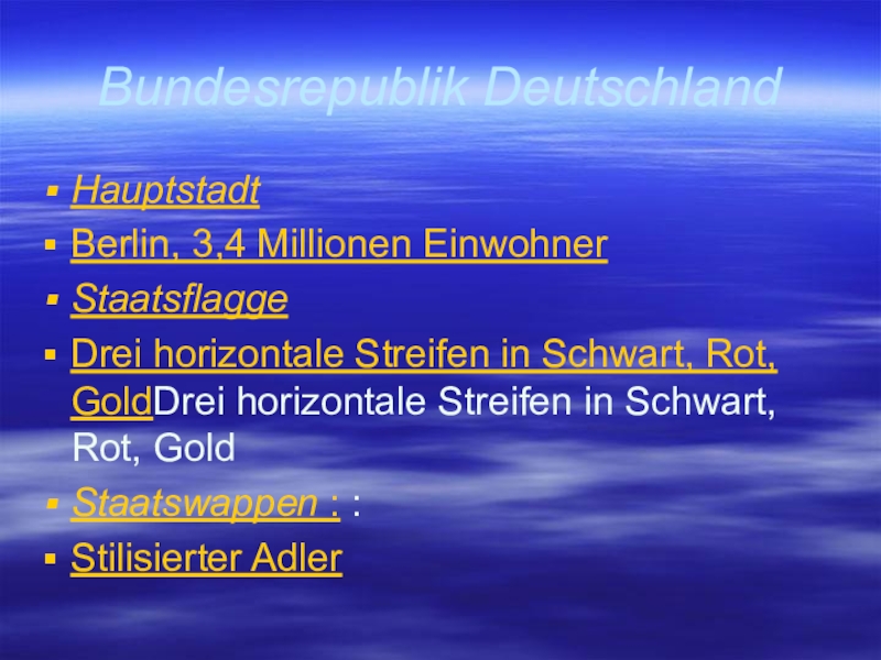 Bundesrepublik DeutschlandHauptstadt Berlin, 3,4 Millionen EinwohnerStaatsflagge Drei horizontale Streifen in Schwart, Rot, GoldDrei horizontale Streifen in Schwart, Rot, Gold Staatswappen : : Stilisierter Adler