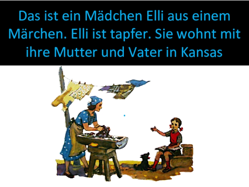 Das ist ein Mädchen Elli aus einem Märchen. Elli ist tapfer. Sie wohnt mit ihre Mutter und Vater in Kansas.