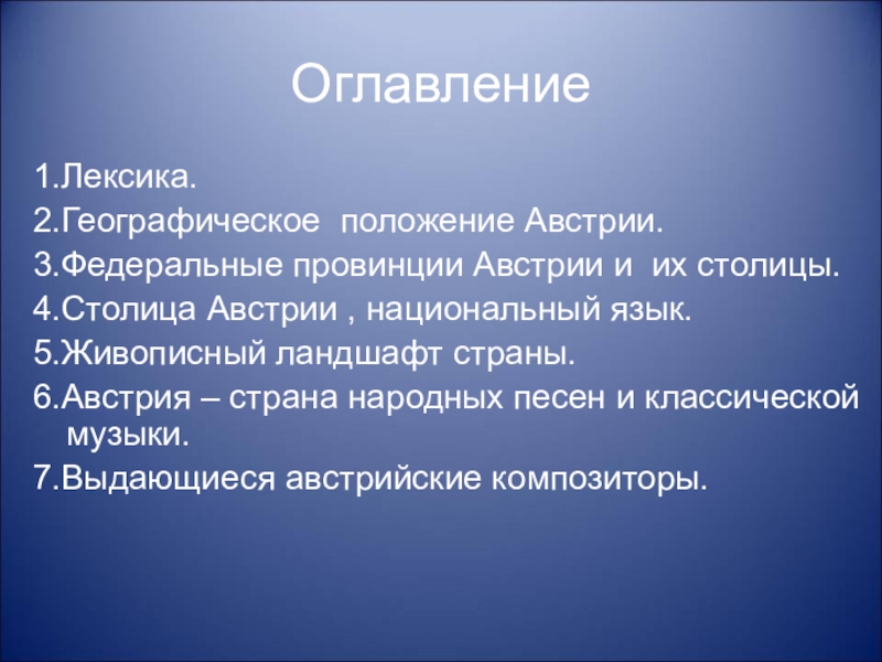 Оглавление1.Лексика.2.Географическое положение Австрии.3.Федеральные провинции Австрии и их столицы.4.Столица Австрии , национальный язык.5.Живописный ландшафт страны.6.Австрия – страна народных песен и классической музыки.7.Выдающиеся австрийские композиторы.