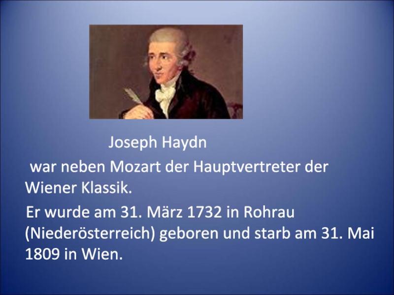 Er wurde am 31. März 1732 in Rohrau (Niederösterreich) geboren und starb am 31. Mai 1809 in Wien.