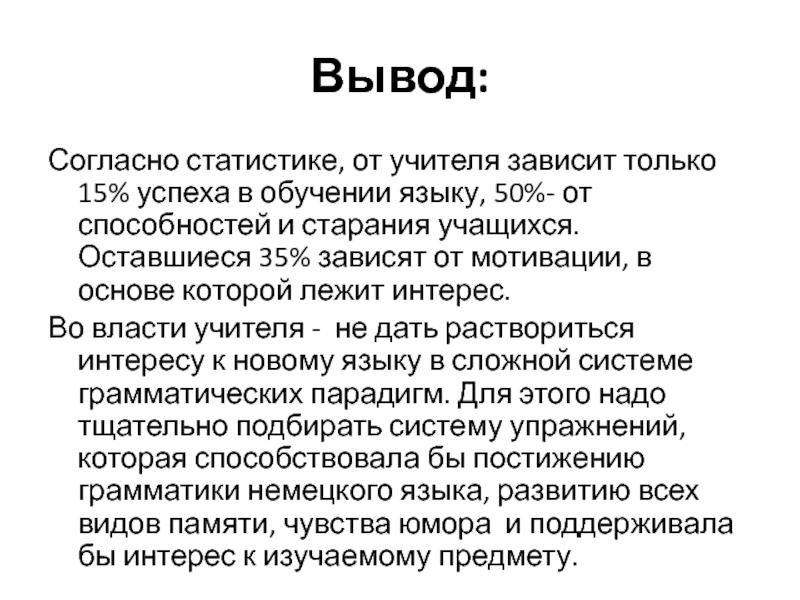 50%- от способностей и старания учащихся. Оставшиеся 35% зависят от мотивации, в основе которой лежит интерес.
