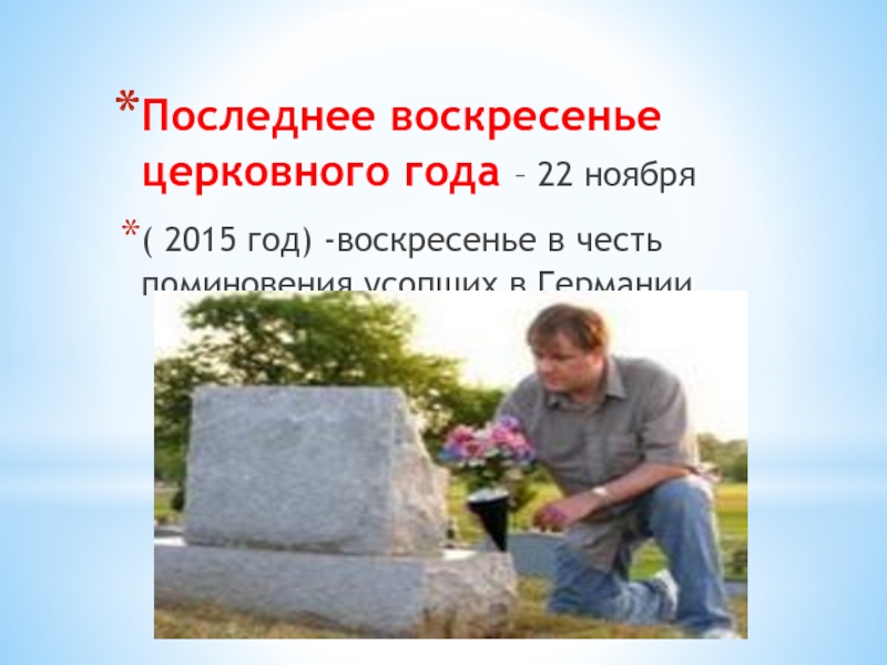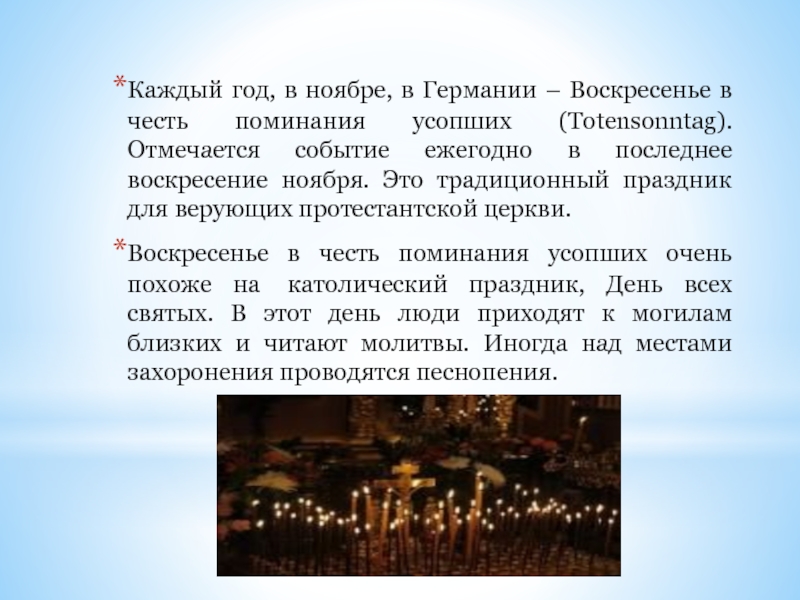 Слайд 33Традиционно на Воскресенье в честь поминания усопших в протестантских храмах Германии