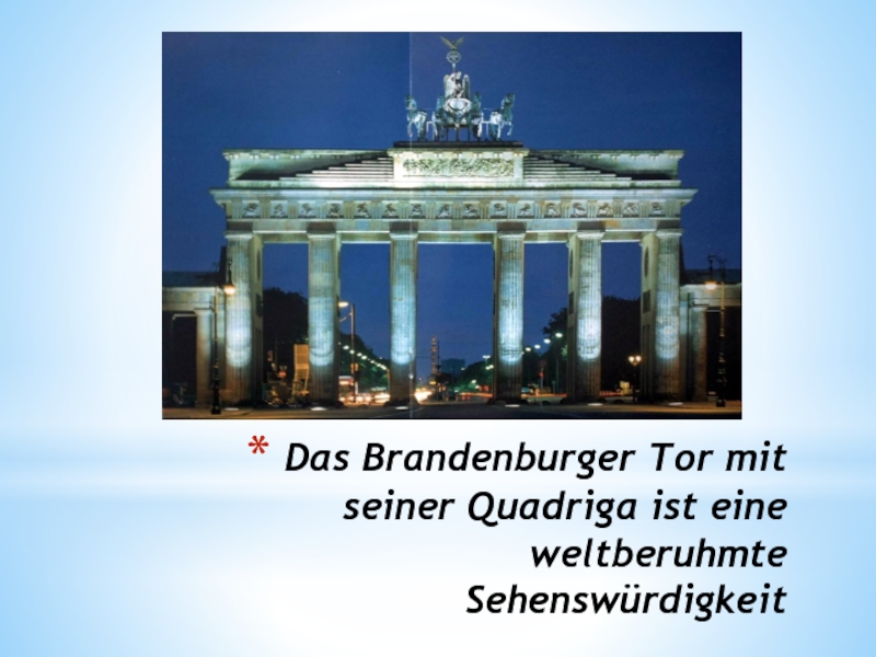 Слайд 2 Das Brandenburger Tor mit seiner Quadriga ist eine weltberuhmte Sehenswürdigkeit