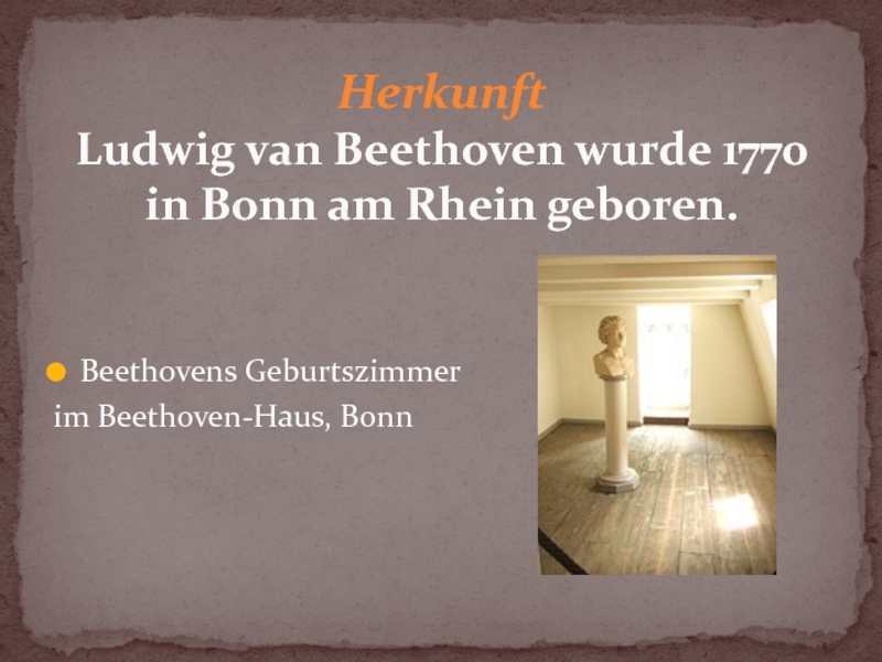 Beethovens Geburtszimmer im Beethoven-Haus, BonnHerkunft Ludwig van Beethoven wurde 1770 in Bonn am Rhein geboren.