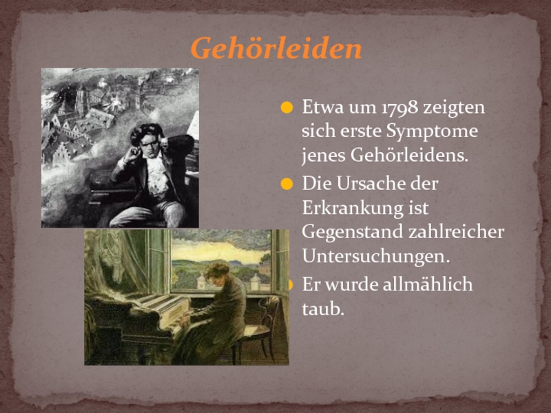 Gehörleiden Etwa um 1798 zeigten sich erste Symptome jenes Gehörleidens.Die Ursache der Erkrankung ist Gegenstand zahlreicher Untersuchungen.Er
