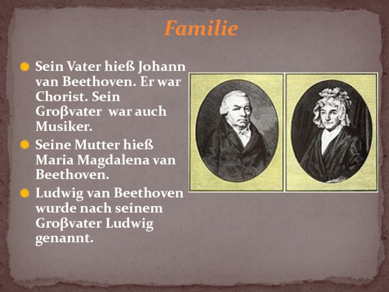Familie Sein Vater hieß Johann van Beethoven. Er war Chorist. Sein Groβvater war auch Musiker.Seine