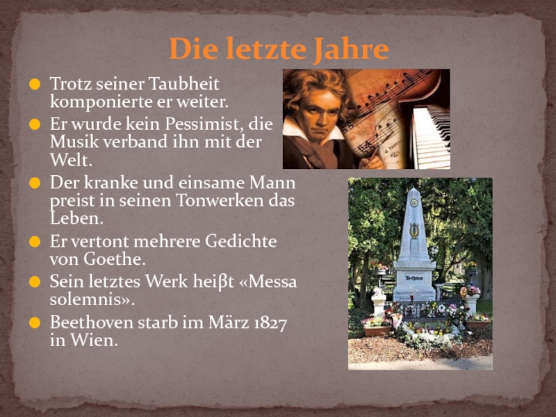 Die letzte Jahre  Trotz seiner Taubheit komponierte er weiter. Er wurde kein Pessimist, die Musik verband ihn