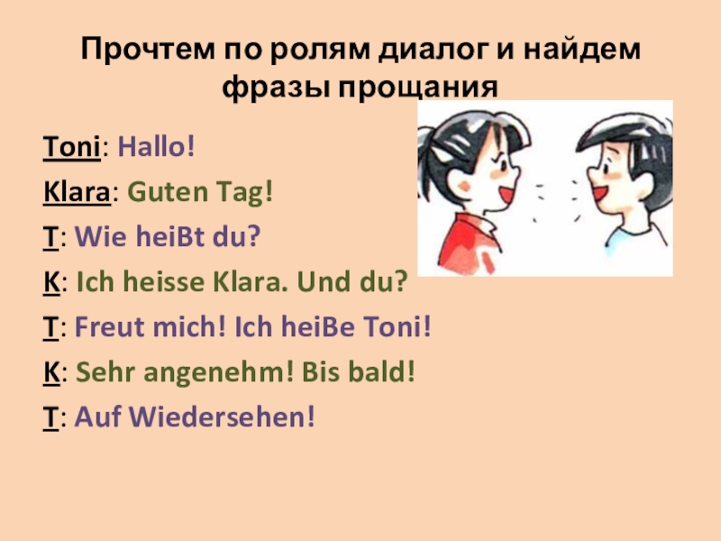 Прочтем по ролям диалог и найдем фразы прощанияToni: Hallo!Klara: Guten Tag!T: Wie heiBt du?K: Ich heisse Klara.