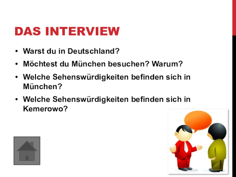 Das InterviewWarst du in Deutschland?Möchtest du München besuchen? Warum?Welche Sehenswürdigkeiten befinden sich in München?Welche Sehenswürdigkeiten befinden sich
