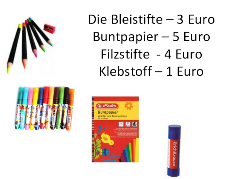 Слайд 5Die Bleistifte – 3 Euro Buntpapier – 5 Euro Filzstifte - 4 Euro Klebstoff
