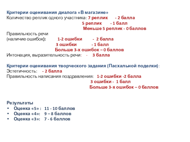 Критерии оценивания диалога «В магазине»Количество реплик одного участника: 7 реплик    - 2 балла