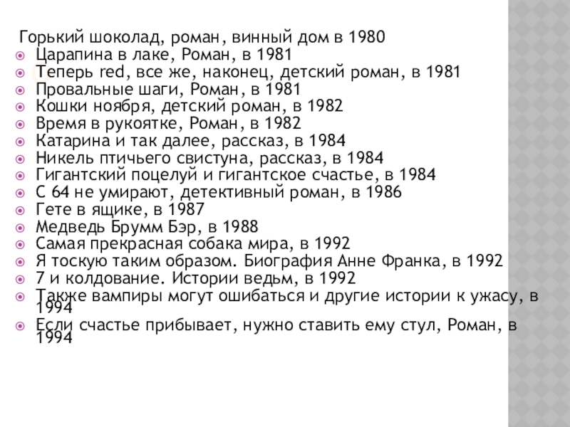 года начала писать свою первую книгу „ Bitterschokolade“ (1980), награжденную премией за детскую литературу - "Oldenburger Kinder- und Jugendbuchpreis".